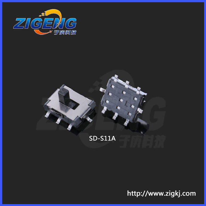 型號SD-S081H貼片拔動開關(guān),一個黑色按鈕和兩個頂點(diǎn),帶六個插件位于兩邊